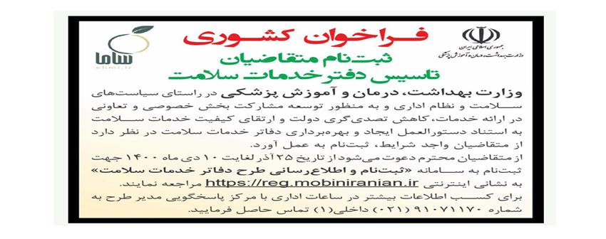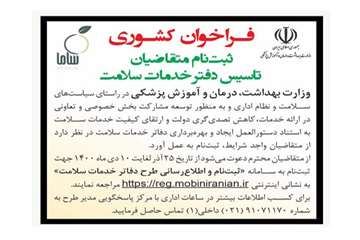 فراخوان کشوری ثبت نام متقاضیان تأسیس دفاتر خدمت سلامت