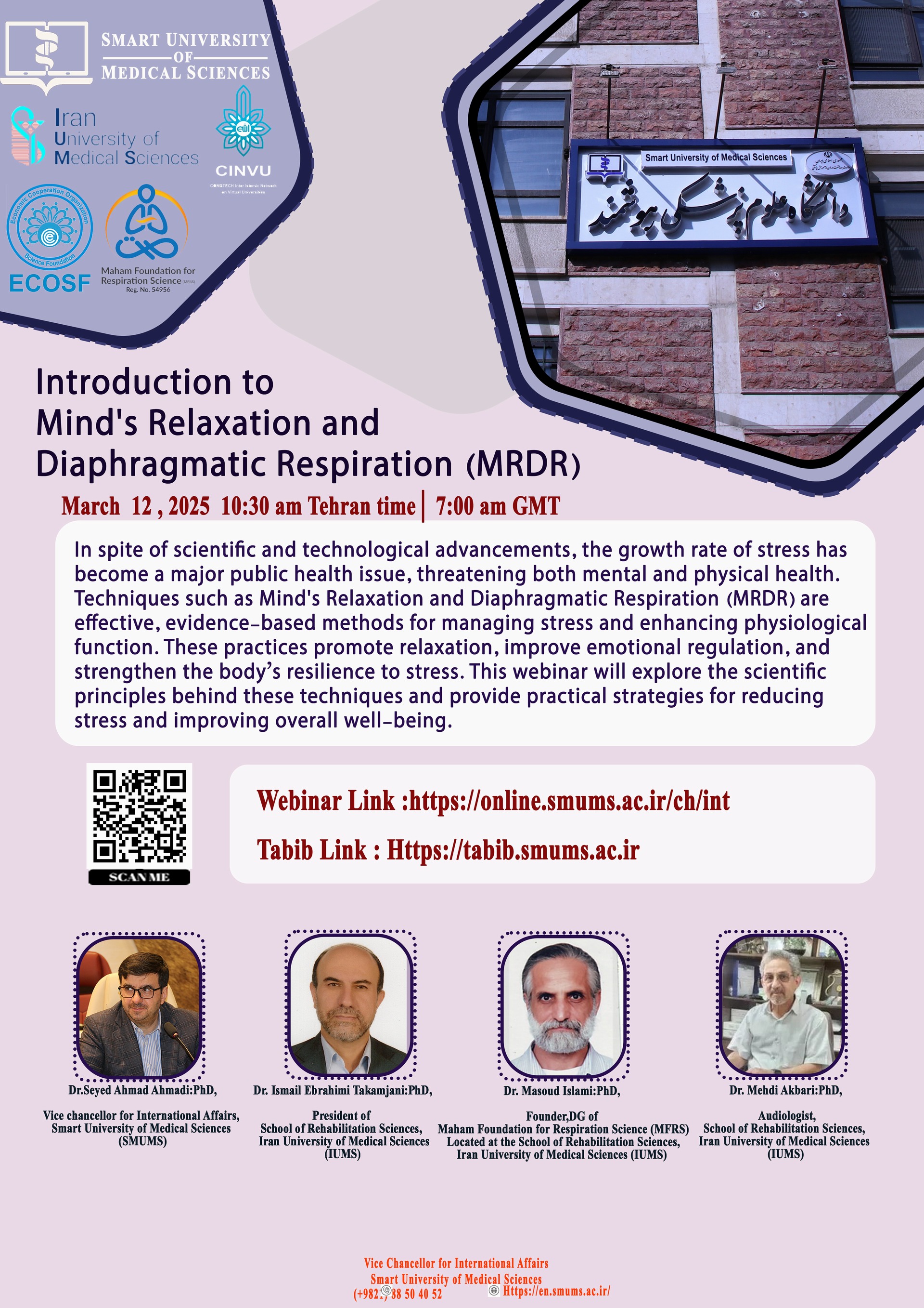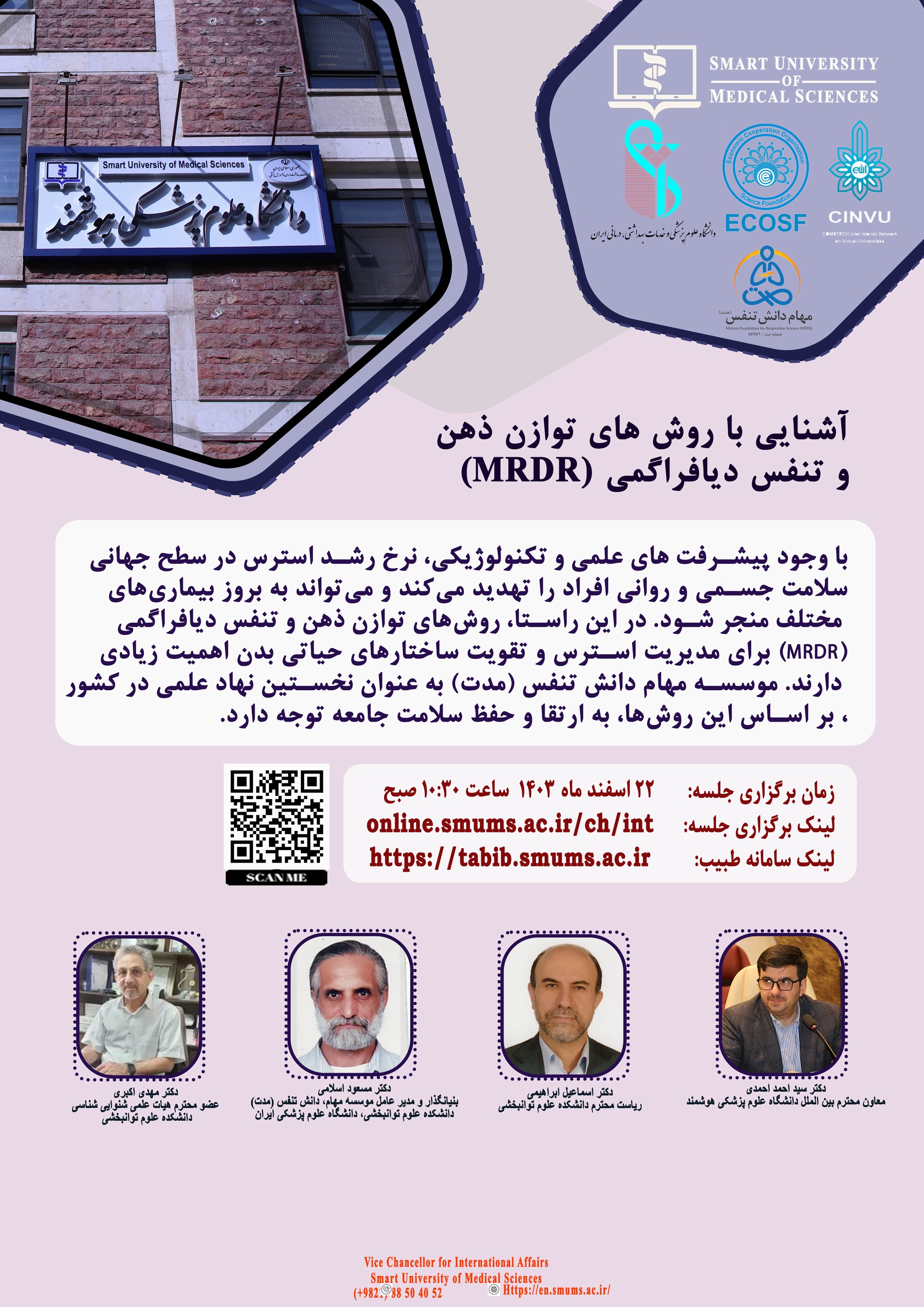 به اطلاع اساتید، دانشجویان و افراد علاقمند می رساند دانشگاه علوم پزشکی هوشمند در نظر دارد، وبینار  بین المللی " Introduction to Mind Balance Techniques " با سخنرانی جناب آقای دکتر مسعود اسلامی، جناب آقای دکتر اسماعیل ابراهیمی، ریاست دانشکده علوم توانبخشی، دانشگاه علوم پزشکی ایران و جناب آقای دکتر مهدی اکبری، عضو هیات علمی شنوایی سنجی دانشکده علوم توانبخشی دانشگاه علوم پزشکی ایران، به زبان انگلیسی، روز چهارشنبه مورخ ۱۴۰۳٫۱۲٫۲۲ از ساعت ۱۰:۳۰ لغایت ۱۲:۳۰ به صورت آنلاین  برگزار نماید.