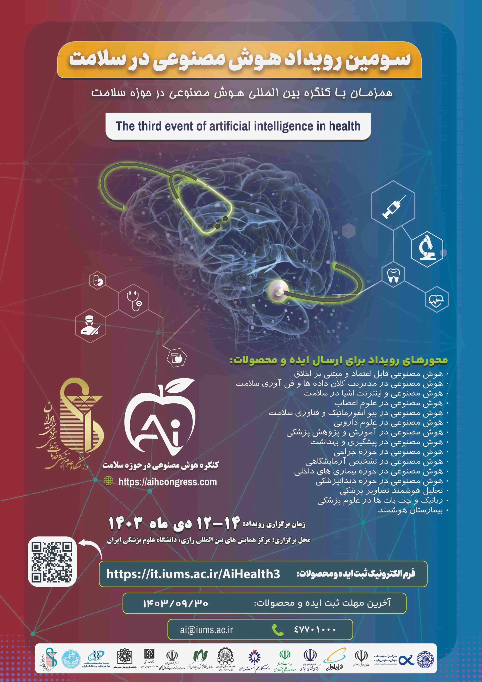 سومین رویداد هوش مصنوعی در سلامت، همزمان با کنگره بینالمللی هوش مصنوعی از تاریخ ۱۲ الی ۱۴ دیماه ۱۴۰۳ در مرکز همایشهای بینالمللی رازی برگزار میشود.